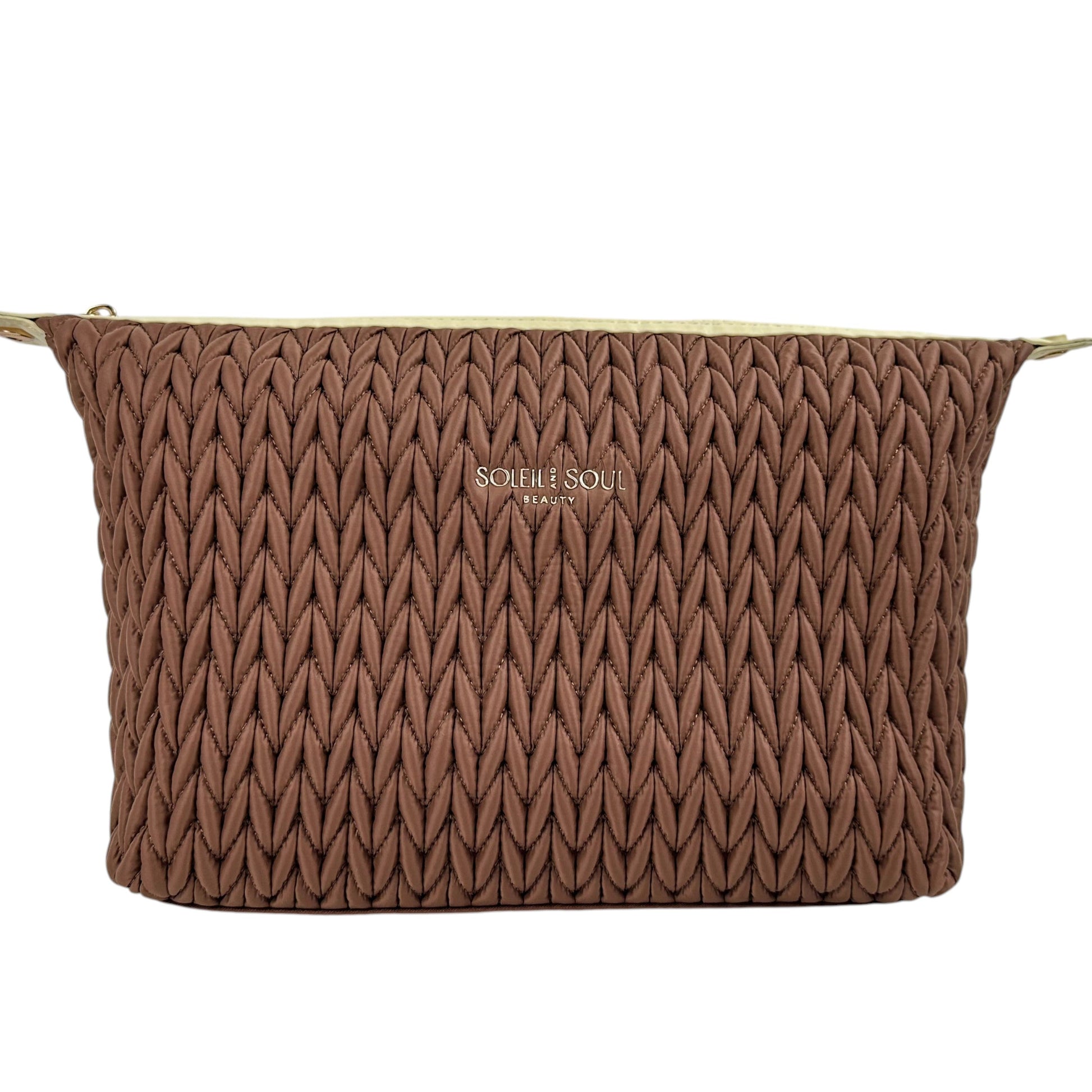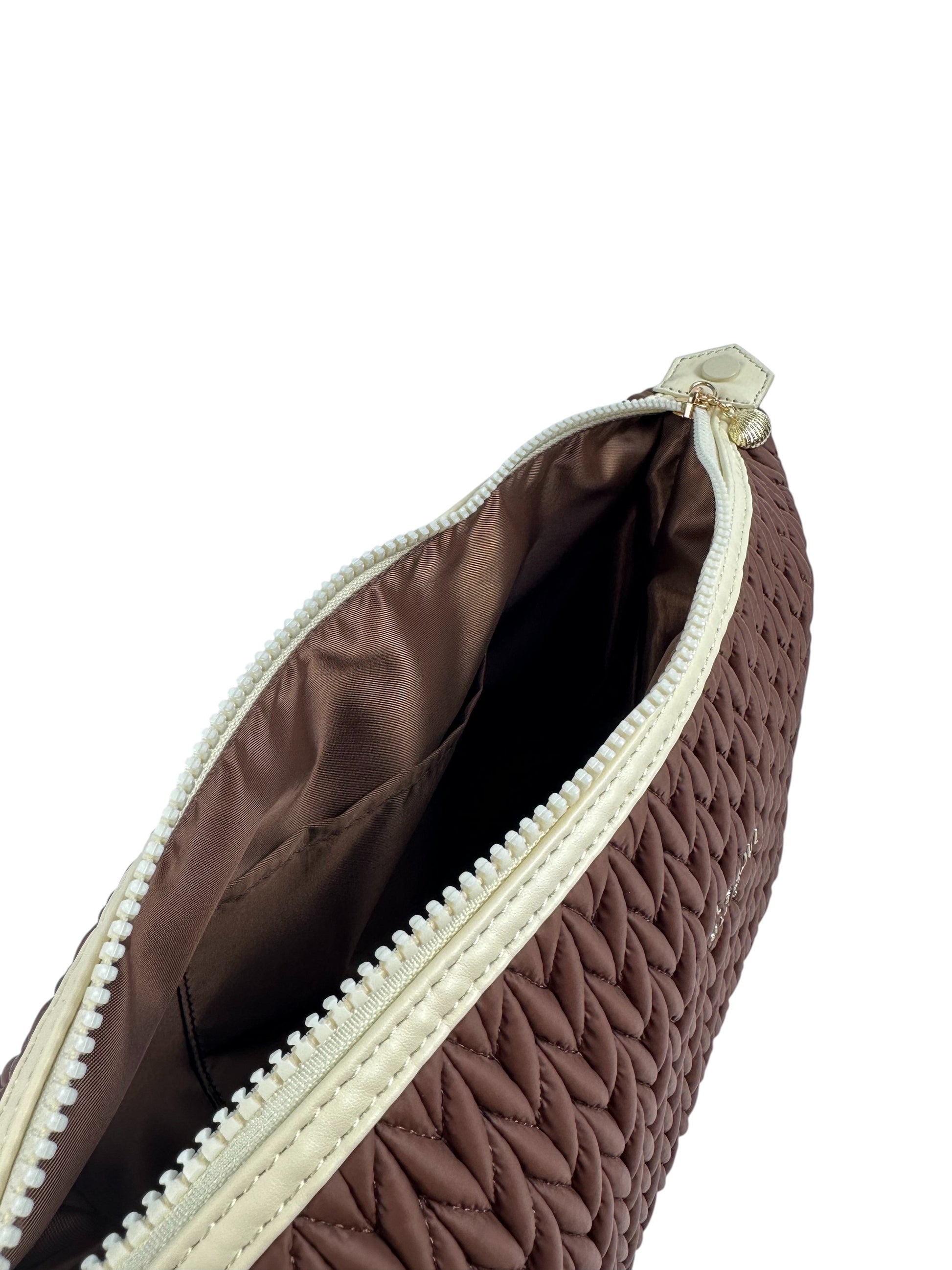 Spacious enough to hold everything from daily essentials to a full beauty routine, this larger silhouette delivers versatility without compromise. Adorned with chocolate lining and a delicate seashell charm on the zip, it combines practical functionality with understated elegance. The perfect beauty bestie for everyday use